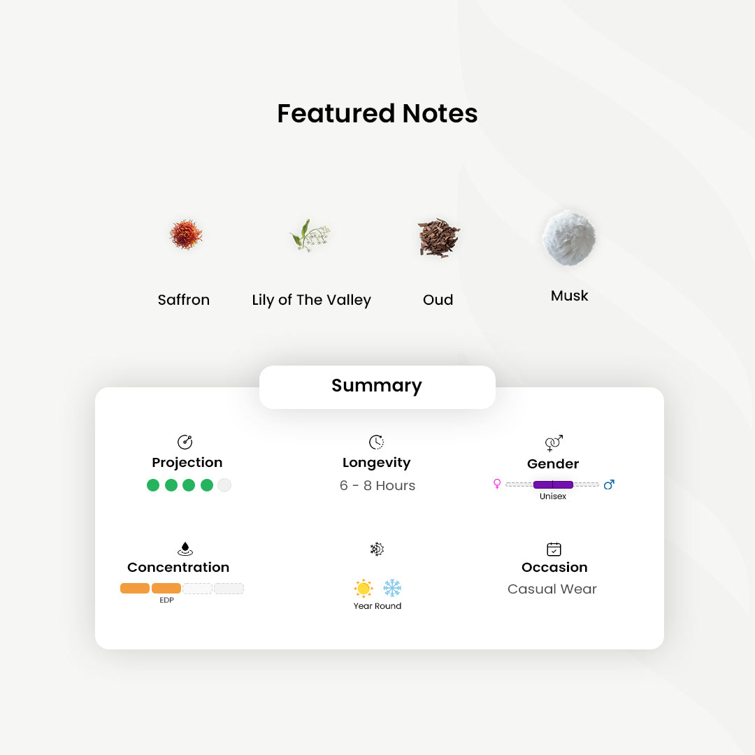 Abyat by Arabian Oud is a poetic composition that blends tradition with refined elegance. It opens with the golden spice of saffron softened by the green, delicate touch of lily of the valley — a pairing that feels both noble and unexpectedly fresh.