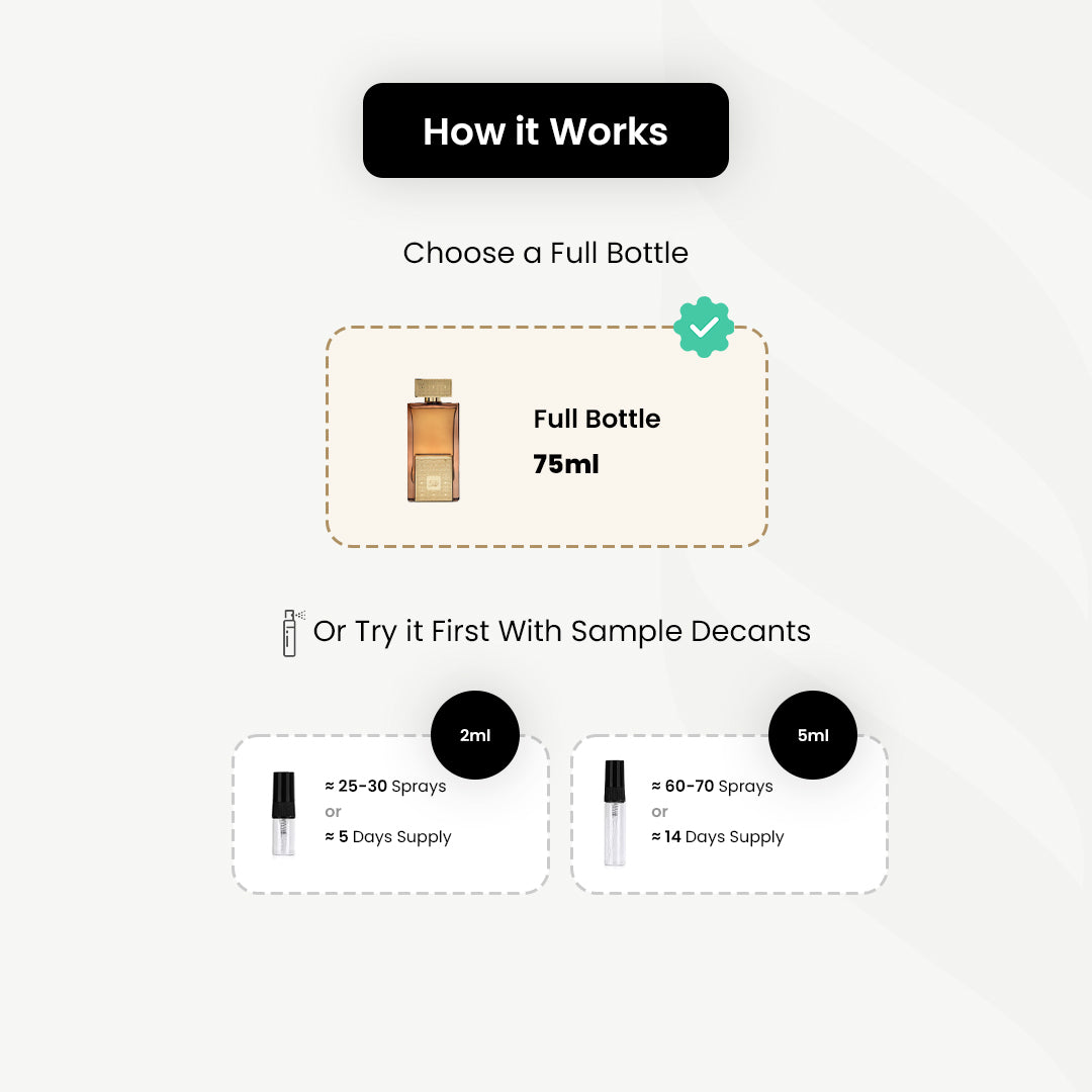 All fragrances listed on our website, are hand curated and purchsed directly from our trusted suppliers in the Middle East. We take authenticity very serious, as it is both illegal and against our mission to share the love of fragrance with a wider audience. Each and every decant is tested and each bottle sold comes with our Authenticity guarantee.