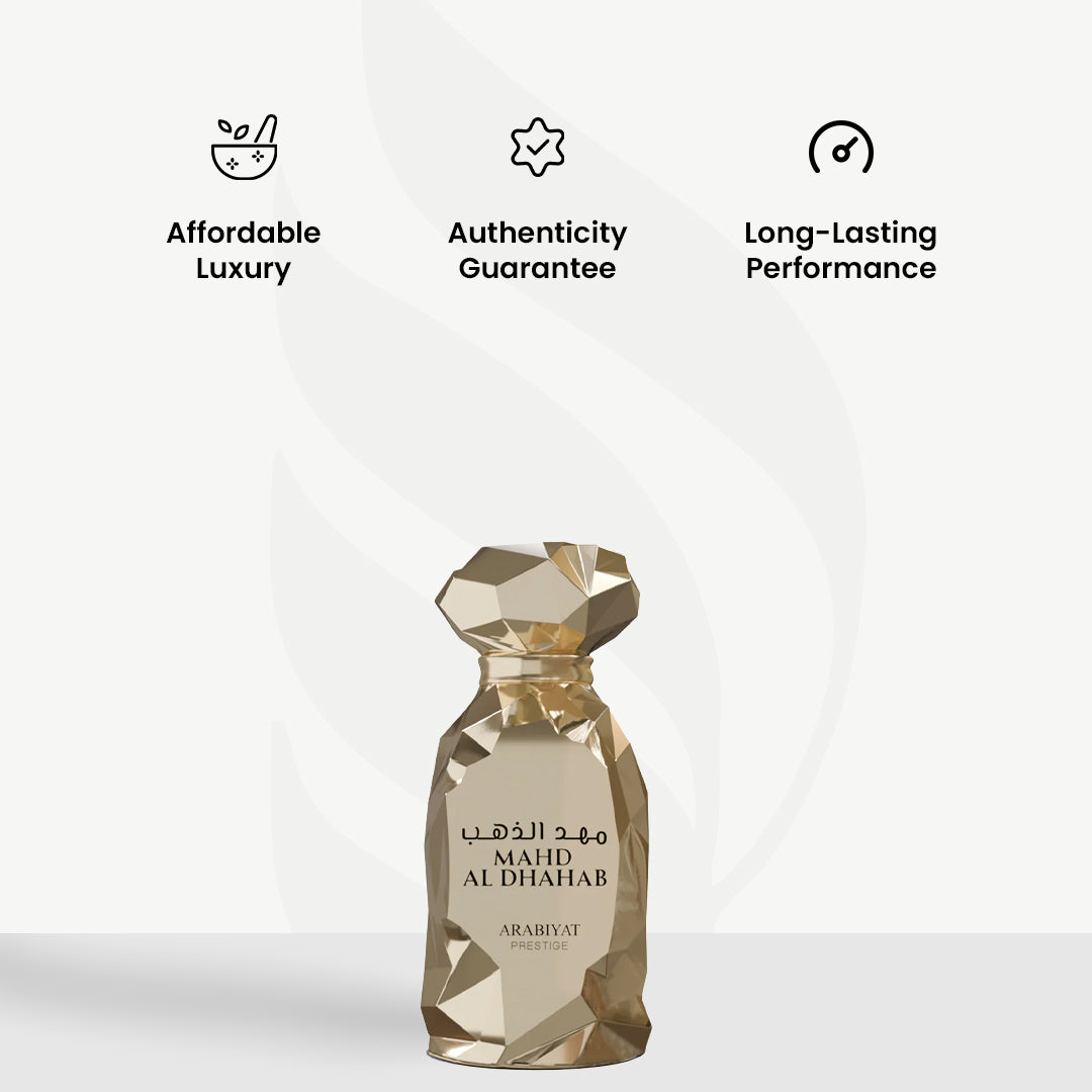 The dry down is indulgent and soft, with creamy sandalwood, rich amber, and earthy patchouli melting into a sweet vanilla base that lingers like a whispered promise. Warm and opulent, Mahd Al Dahab is both refined and addictive.