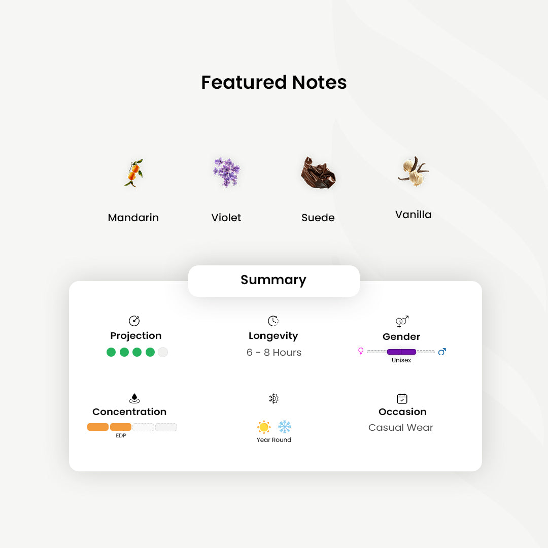 At its heart, violet leaf and immortelle bloom against a backdrop of golden saffron and ripe tropical fruits, conjuring the island’s lush flora and radiant sunsets. As the scent settles, it drapes the skin in soft suede and creamy Madagascar vanilla, softened by white musk and the floral depth of osmanthus. A whisper of agarwood and amber leaves a lasting impression of tropical elegance.
